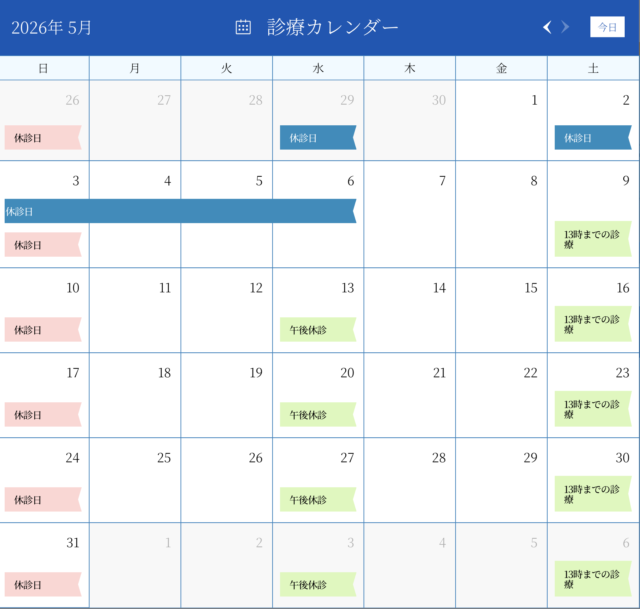 5月の休診について 2026 / 04 / 18 お知らせ5月2日(土)は休診といたします。そのため5月2日(土)〜5月6日(水)まで休診となりますどうぞよろしくお願いいたします。 前の記事へ 一覧へ戻る