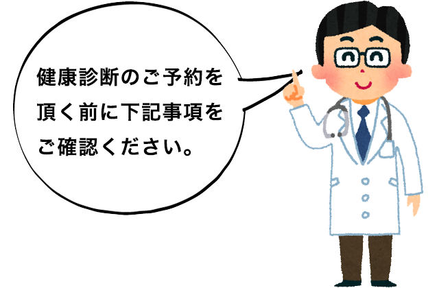 - 予約時刻は『来院時刻』です。『健診開始時刻』ではございませんのでご注意ください。健診はだいたい30分〜1時間ほどかかります。
